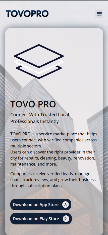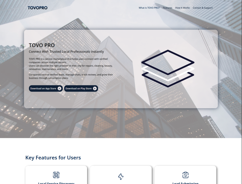 TOVO PRO delivers a complete digital marketplace where users meet trusted professionals with just a tap, and companies gain real business growth through verified leads and smart tools.